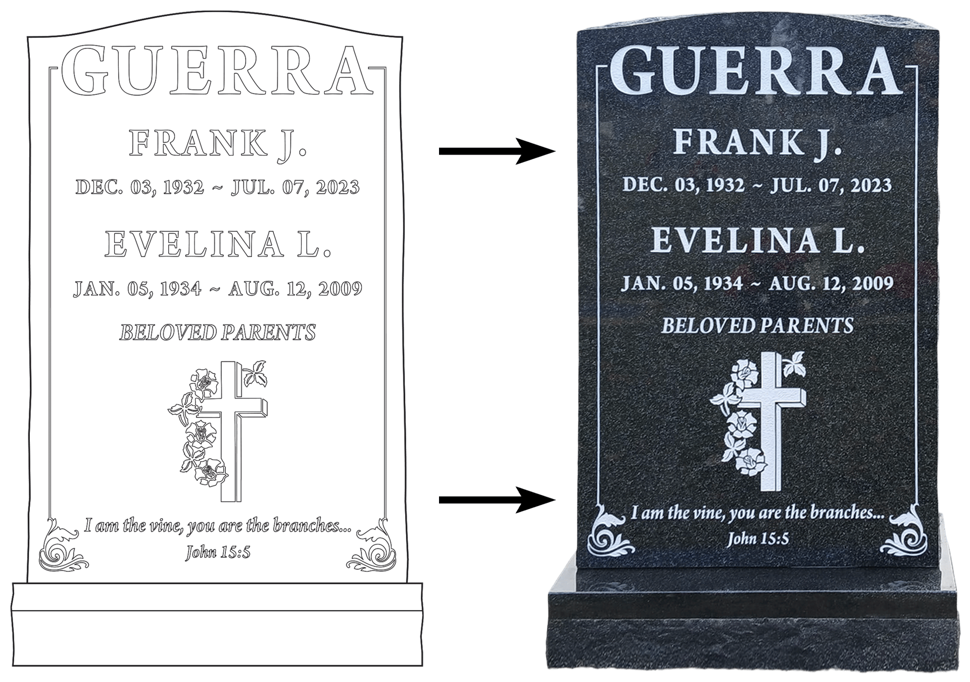 Whether you are looking for a classic flush-to-ground stone or a uniquely custom-shaped marker, we focus intensely on the fine details of the engraving. By thoughtfully balancing the design within the marker’s proportions, we create a piece that is both sophisticated and personal.